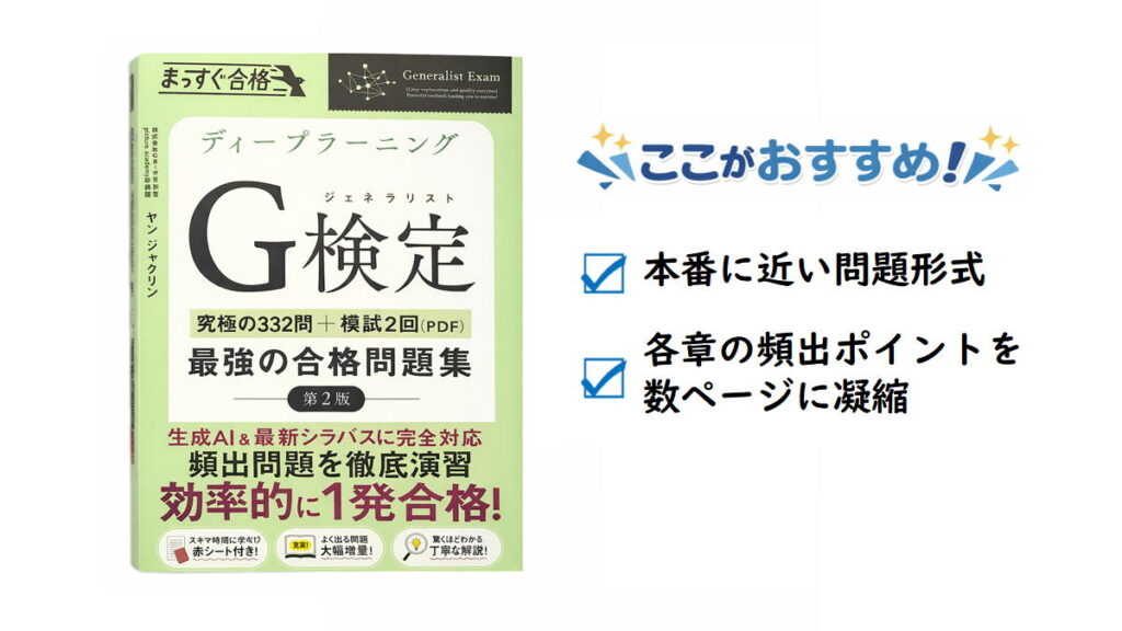 「ディープラーニングG検定(ジェネラリスト)最強の合格問題集」には、PDFで191問が2回分ダウンロードできるので練習が可能です。
