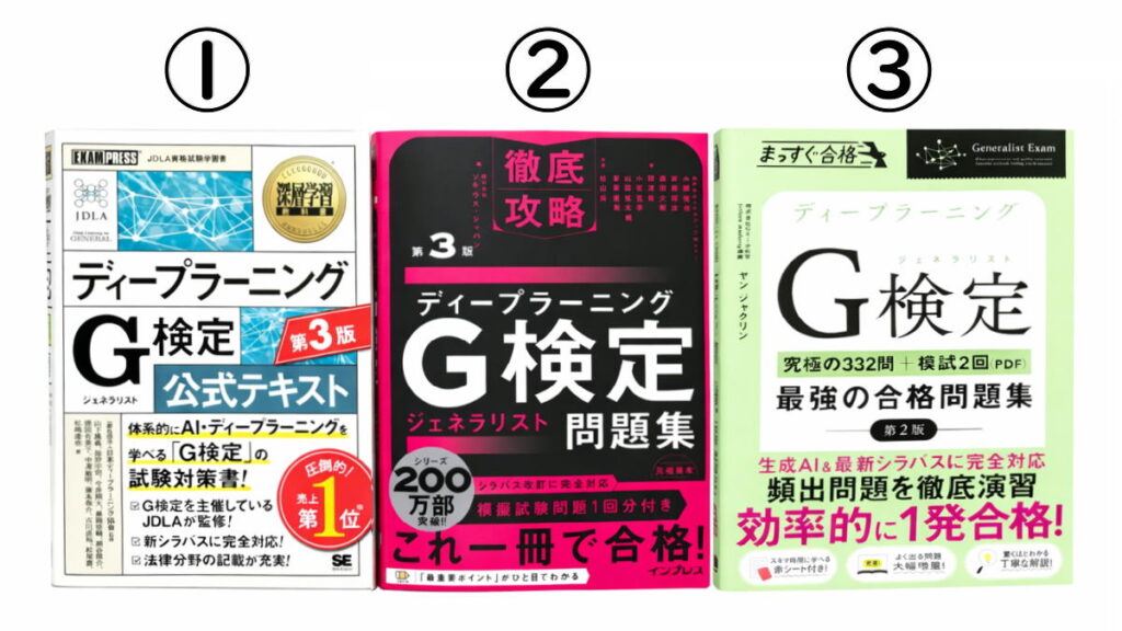 2回目受験の際に使用したテキスト(画像③)は「ディープラーニングG検定(ジェネラリスト)最強の合格問題集 第2版」です。問題集は最初からこちらにしておけばよかったと感じています。